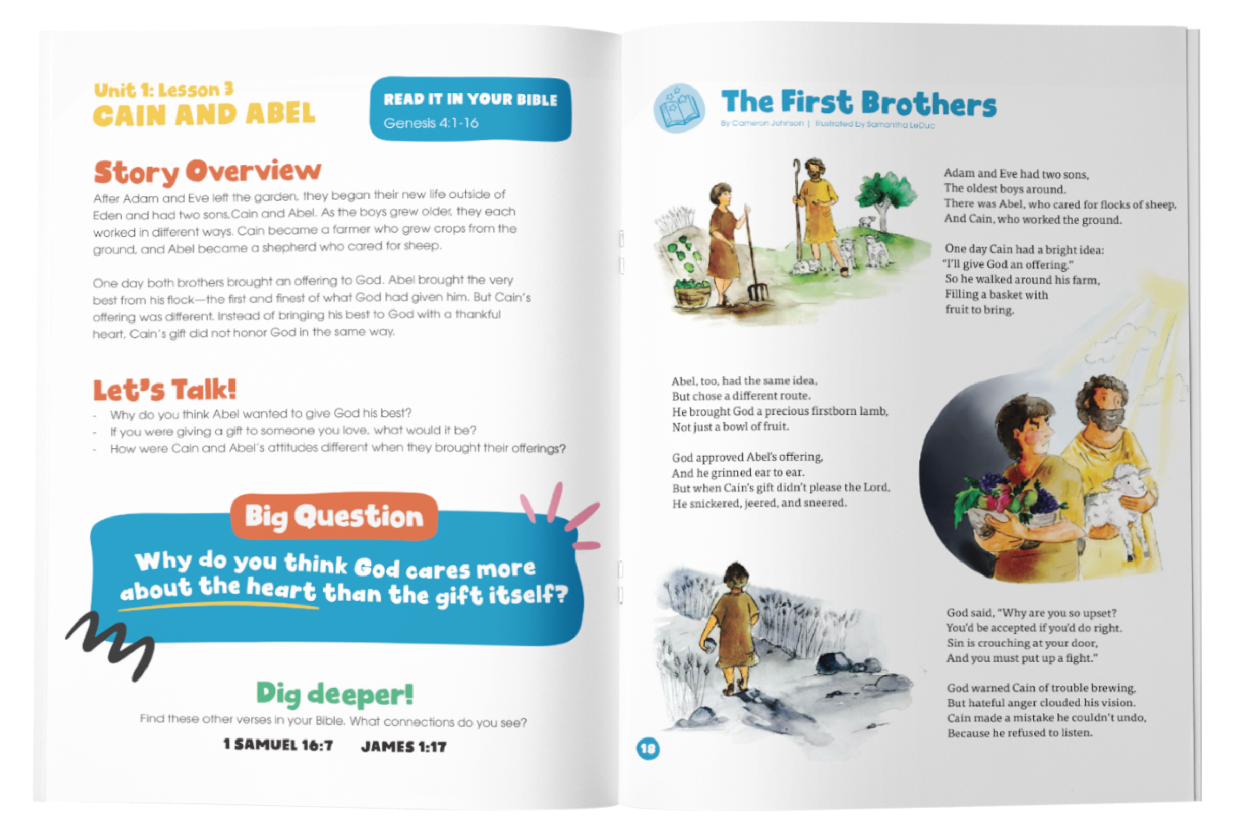 Overview of each story with simple questions and tasks for kids to engage their Bible