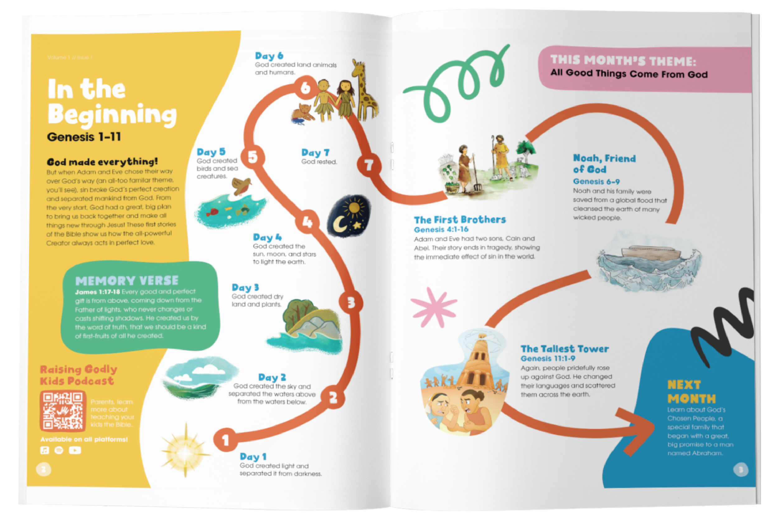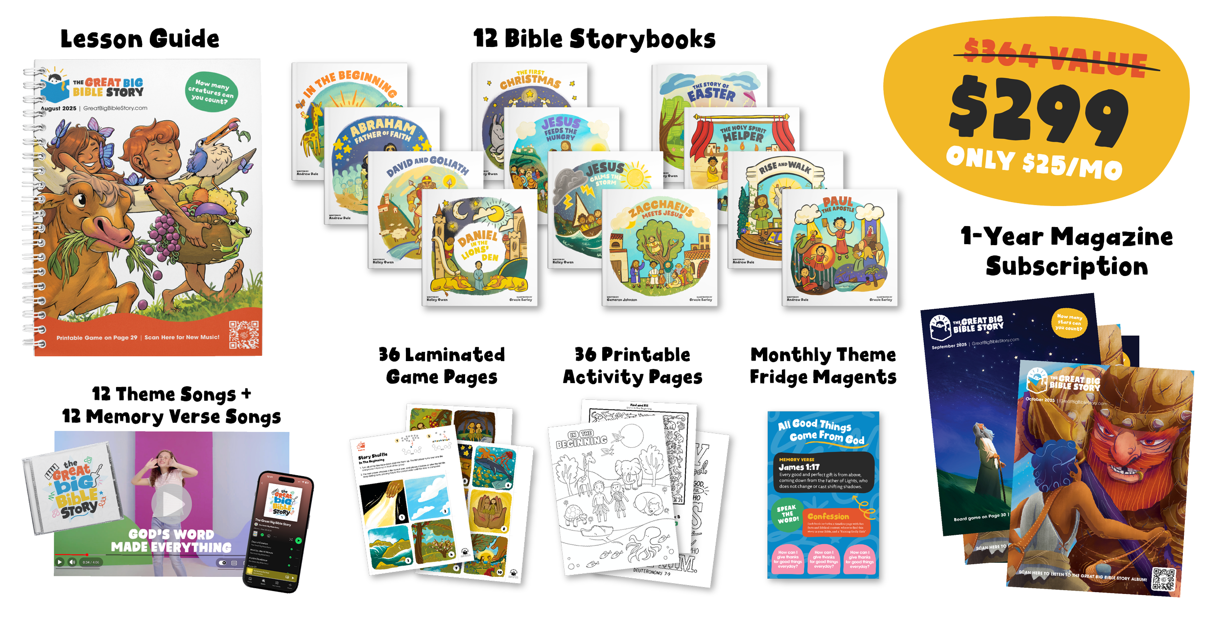 The Great Big Bible Story is designed to be genuinely fun for kids without ever losing sight of what matters most: God’s Word. Over 12 monthly units, your family will journey through the full Bible narrative with 60 Bible lessons that are made to stick!